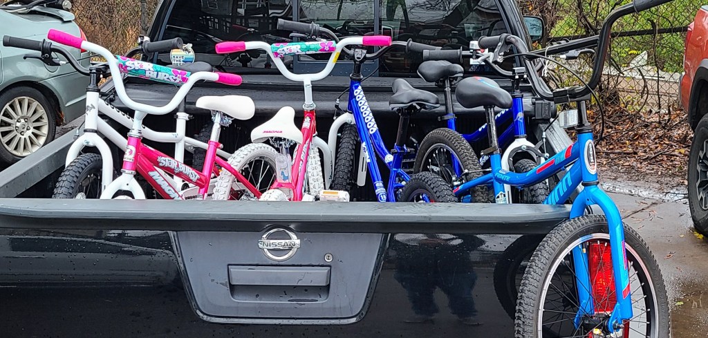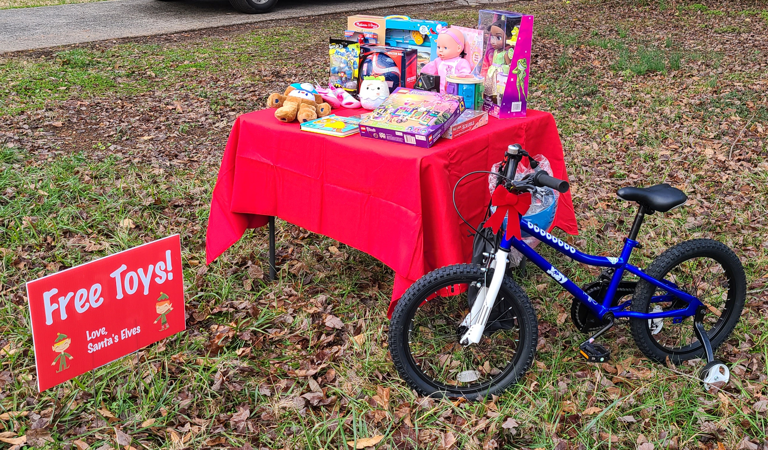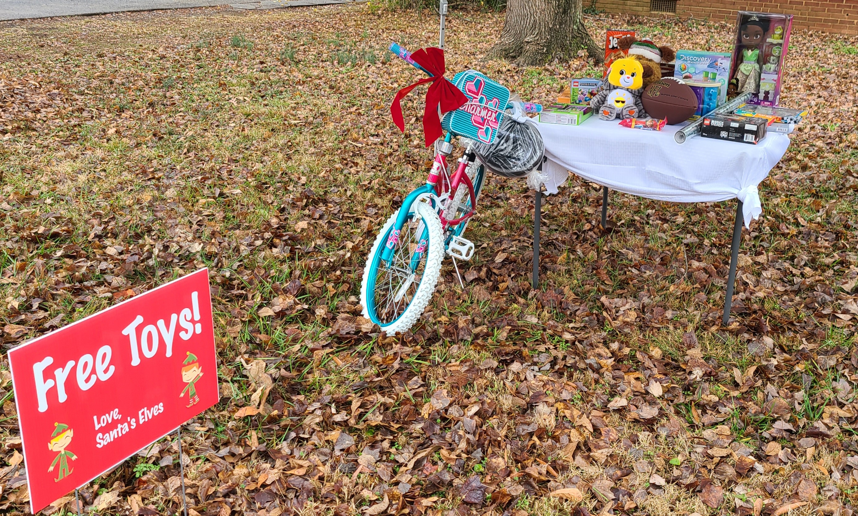 Every year Santa’s elves set up a table on a street in Eastway Sheffield neighborhood, Charlotte, NC with toys and bikes right before Christmas.